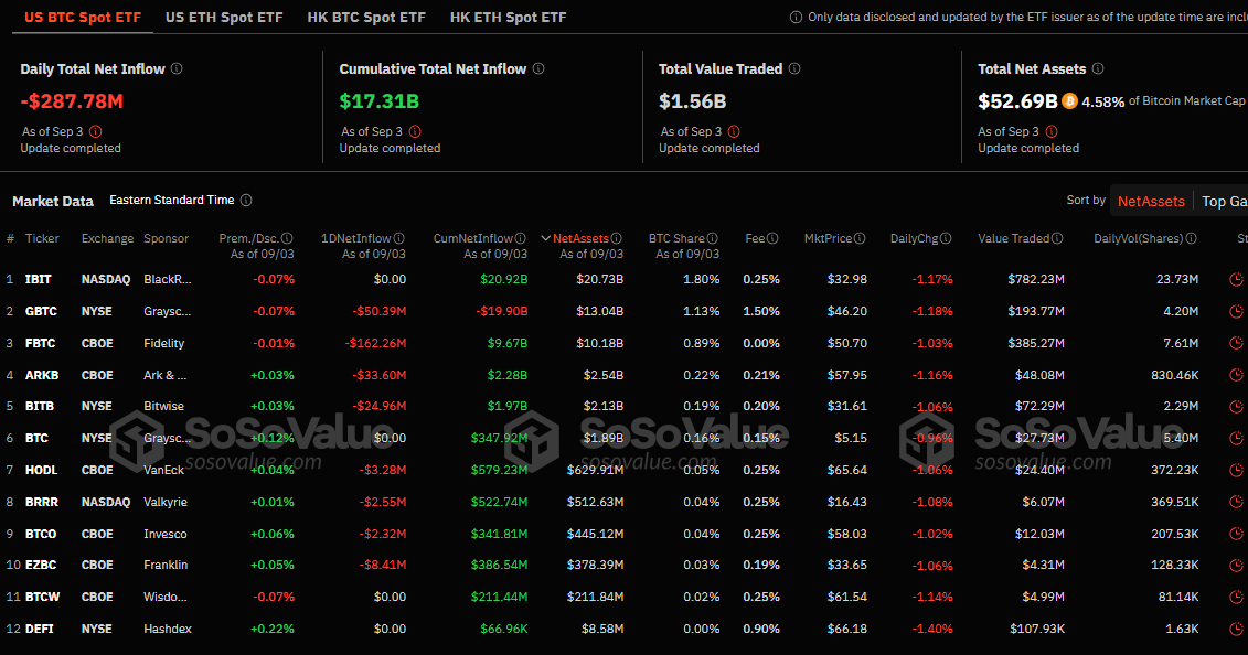 Samtidigt visar data från SosoValue att 12 spot Bitcoin ETF:er registrerade netto utflöden på totalt 287,78 miljoner USD på tisdagen, det största sedan den 1 maj. Fidelity ledde med utflöden på 162,3 miljoner USD, följt av Grayscale med 50,4 miljoner USD.
