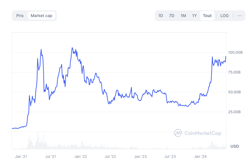 BNB:s marknadsvärde fluktuerar runt 94 miljarder dollar, vilket positionerar den som den fjärde största kryptovalutan efter marknadsvärde. Märket 100 miljarder dollar är en viktig milstolpe att titta på.
