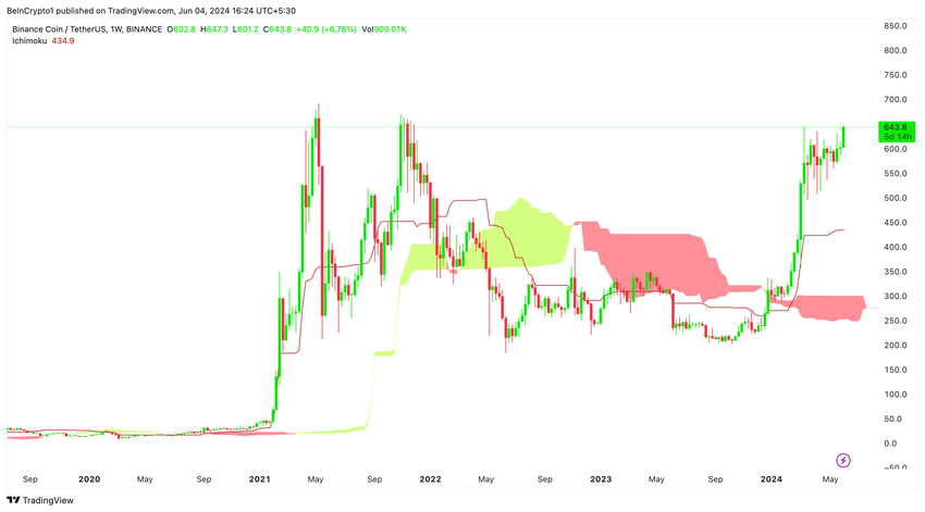 Den röda baslinjen är en avgörande omdrejningspunkt för Binance Coin för att potentiellt skifta från hausse till baisse. Om priset faller under denna baslinje kan det indikera nedåtriktat tryck och leda till en betydande korrigering.