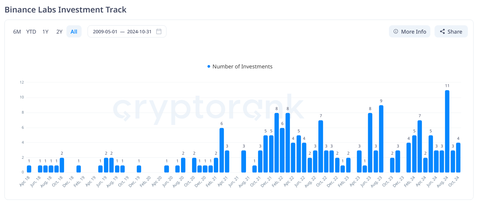 Dessutom visar data från Cryptorank att Binance Labs hittills i år har beslutat att investera i 47 omgångar. Nyckelsektorer i Binance Labs portfölj inkluderar AI (22,22%), restaking (16,7%) och Layer-1 (11,1%).
