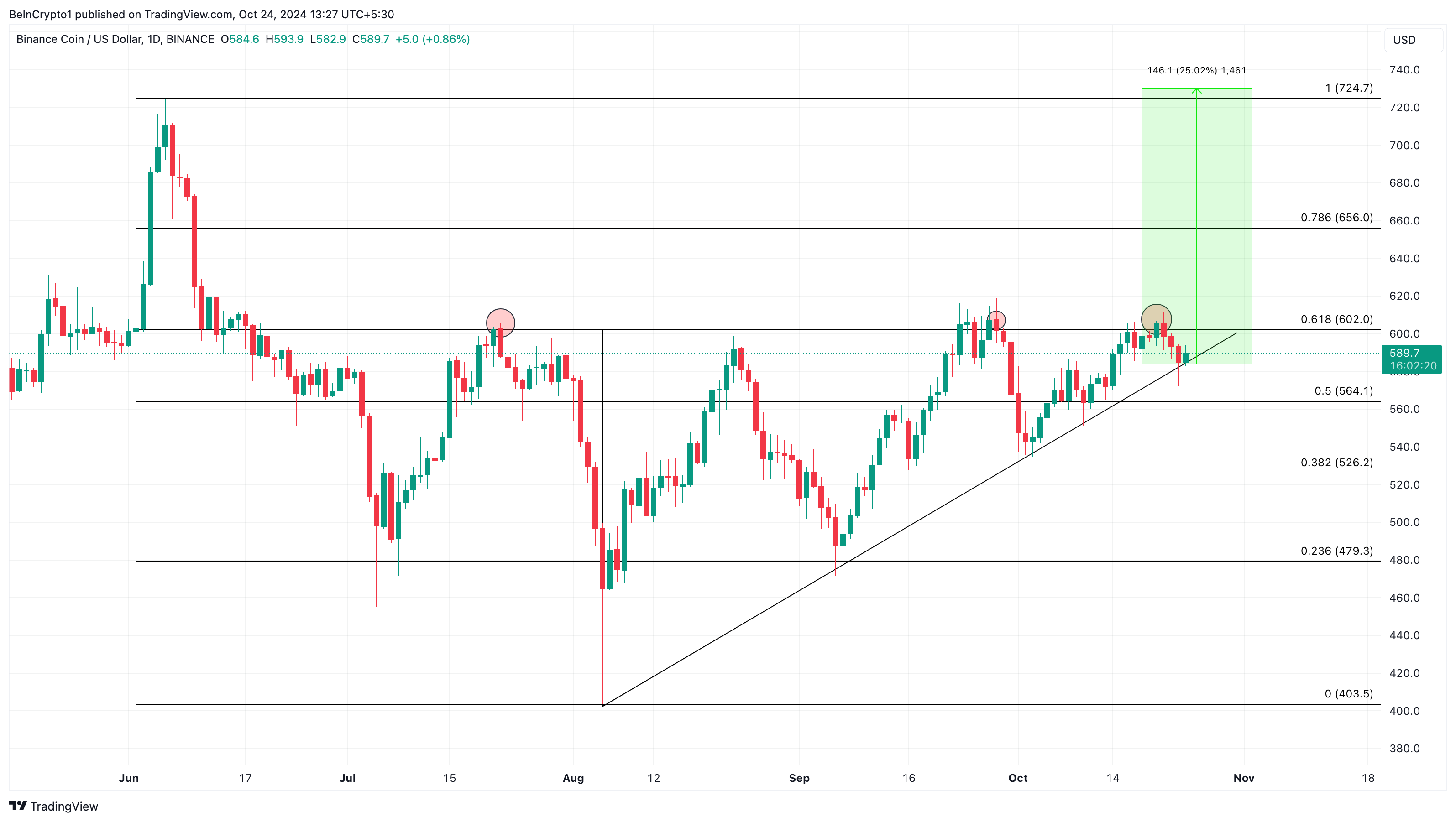 Som synes nedan har BNB:s myntpris upprätthållit detta mönster, vilket tyder på att det kan vara svårt för myntet att uppleva en korrigering. Noterbart är att kryptovalutan måste bryta sig över 61,8% Fibonacci-nivån, som historiskt sett har visat sig vara ett betydande motstånd. För närvarande ligger det motståndet runt 602 USD.