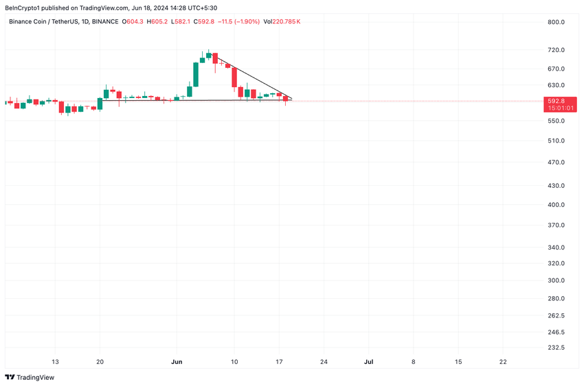Sedan den 6 juni, då det steg till sin högsta nivå hittills i år, har BNB:s pris sjunkit och bildat en fallande triangel.