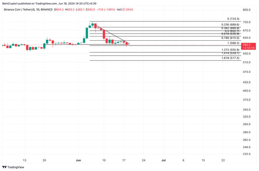 Men om marknadssentimentet fortsätter att vara baisseartat kan det pressa BNB:s pris ner mot $555,90.
