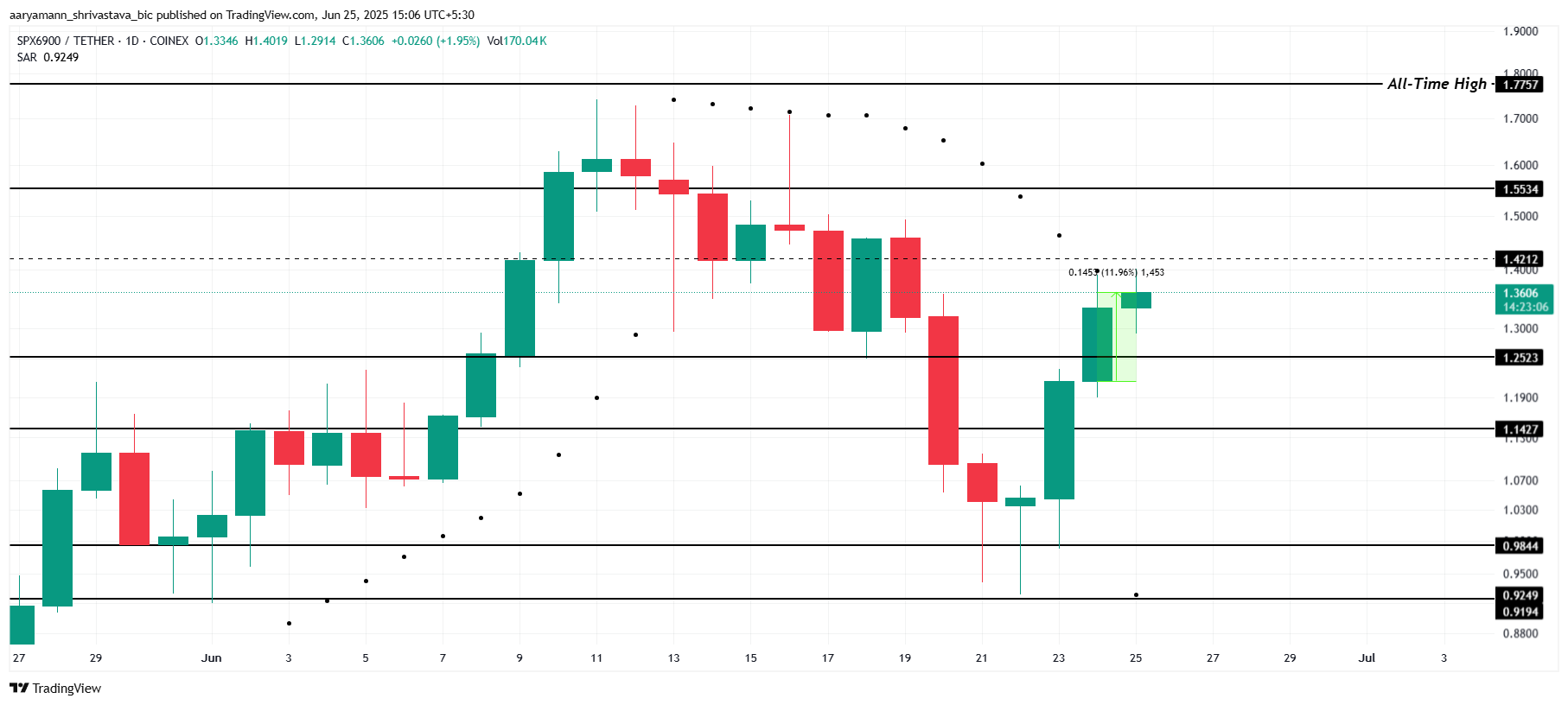 Parabolic SAR-indikatorn under ljusstakarna antyder en stark uppåtgående trend för SPX. Denna tekniska signal pekar på möjligheten att priset bryter igenom 1,42 USD och vänder det till stöd. Med fortsatt momentum kan SPX stiga till 1,55 USD, vilket markerar en viktig motståndsnivå på vägen mot ytterligare vinster.