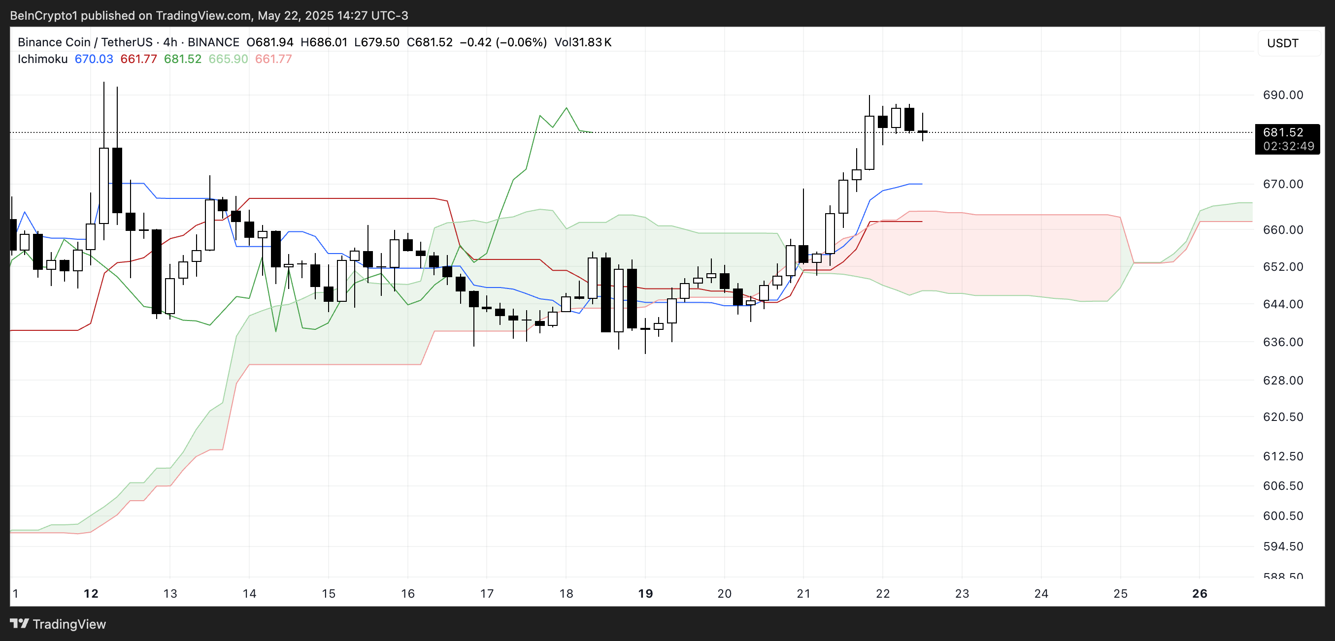 Ichimoku Cloud-diagrammet för BNB visar en stark positiv struktur. Prisrörelsen är tydligt över molnet (Kumo), vilket indikerar en övergripande positiv trend.