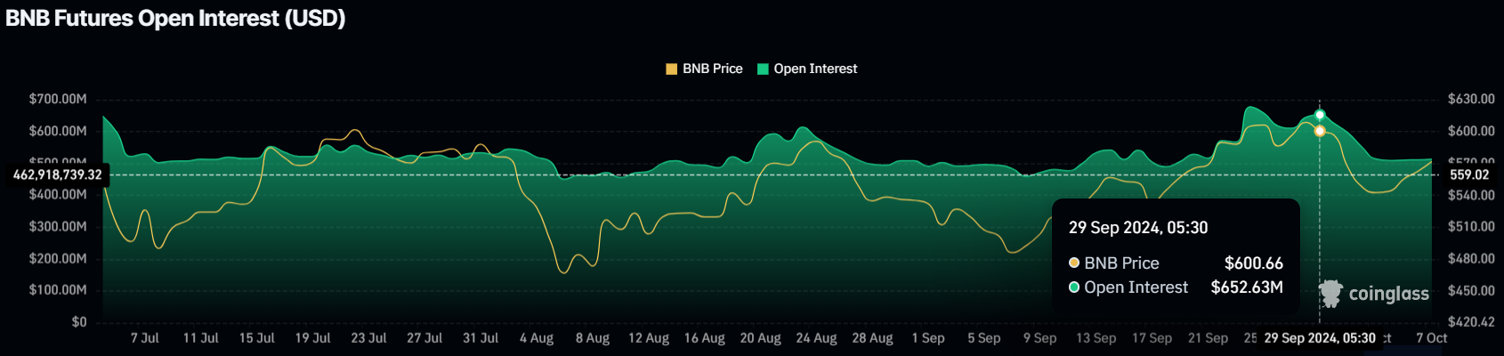 Under de senaste dagarna har det öppna intresset (OI) för BNB minskat med mer än 100 miljoner USD, vilket tyder på att handlare stänger sina positioner. Intressant nog är finansieringsräntan fortfarande positiv, vilket antyder att det är korta handlare som drar sig ur.