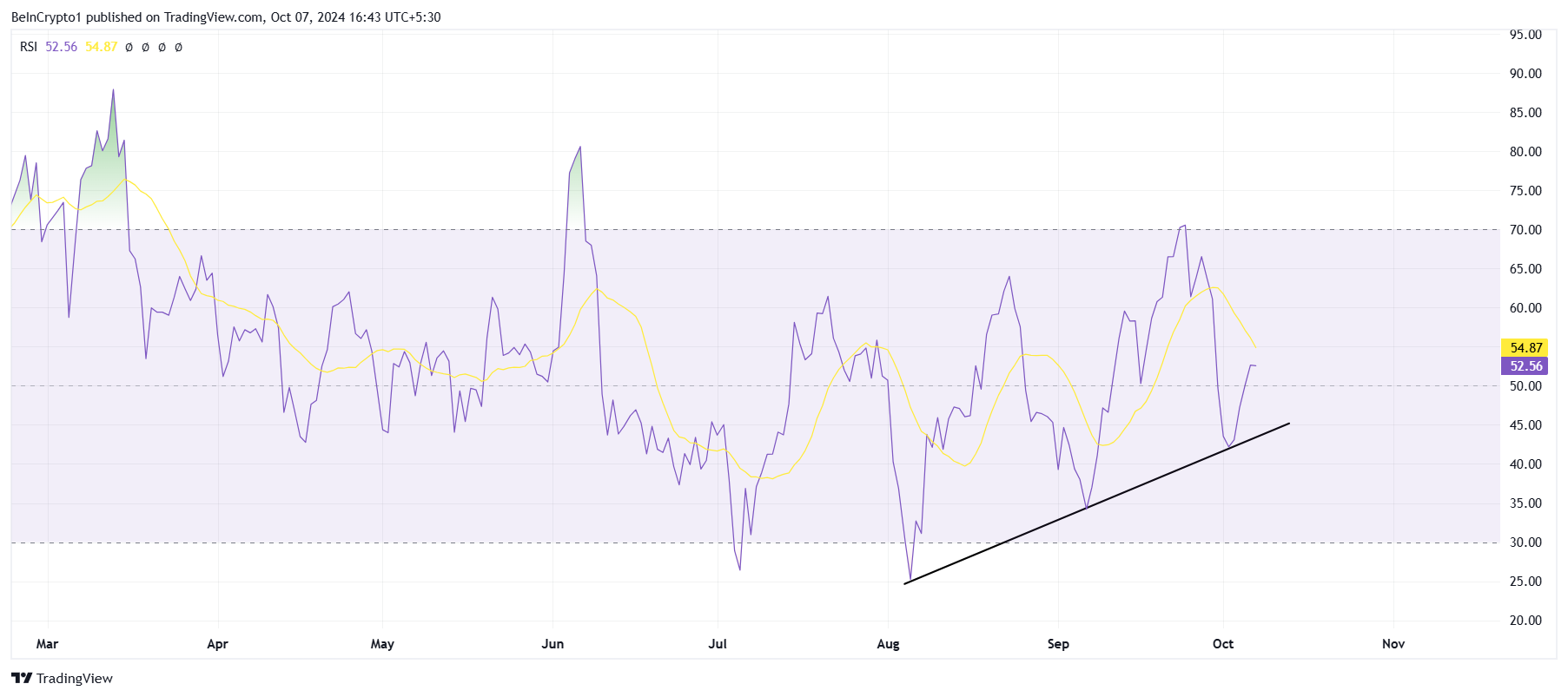 Det övergripande makromomentet för BNB ser lovande ut, med Relative Strength Index (RSI) som visar tecken på en uppåtgående trend. Detta indikator är för närvarande strax över den neutrala linjen på 50,0, vilket indikerar att en uppåtgående momentum byggs upp. När RSI vänder 50,0 till stöd, kan det signalera ytterligare vinster för altcoinet, vilket driver priset högre.