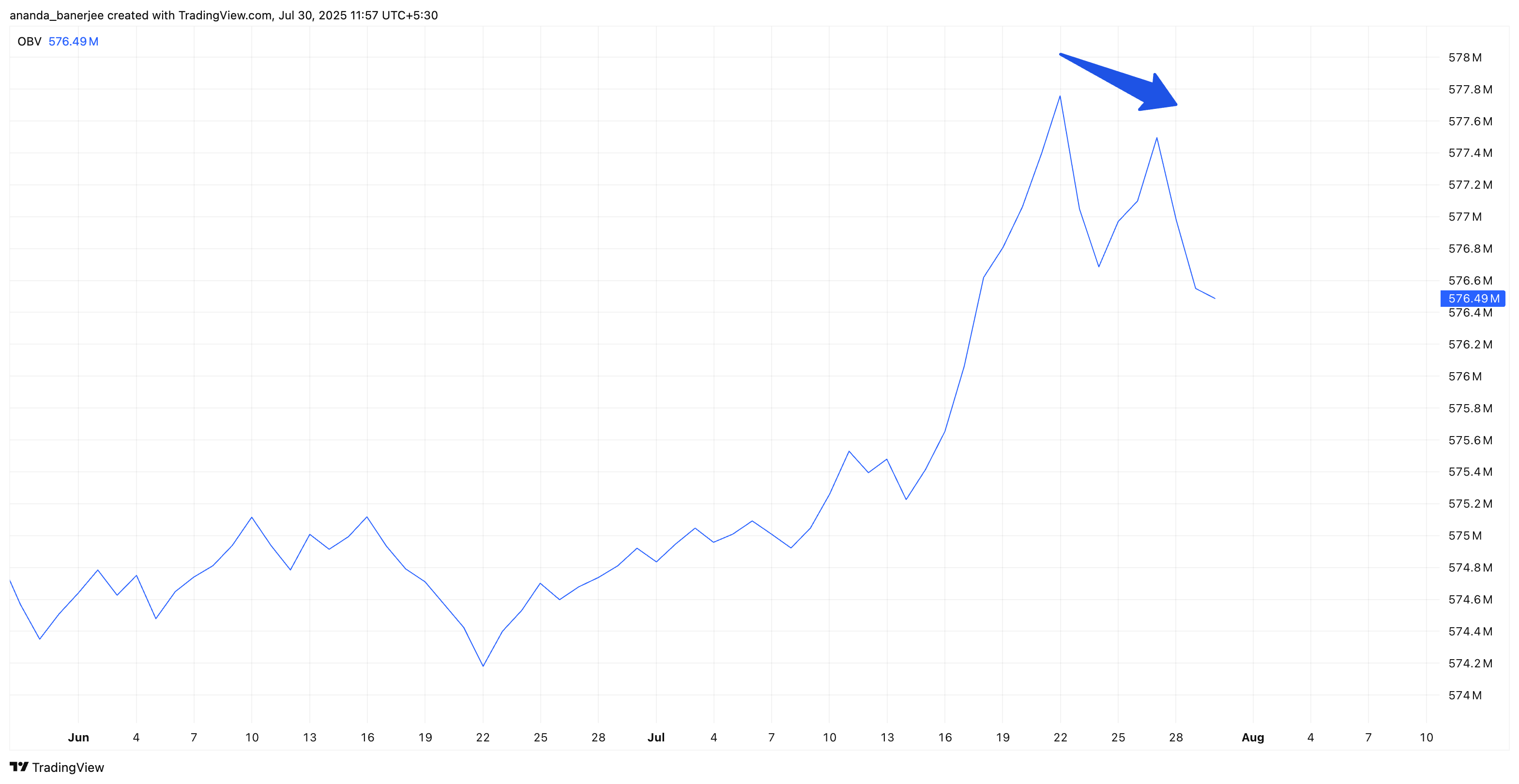 OBV mäter kumulativt handelsvolymflöde — när det trendar lägre medan priset håller sig uppe, signalerar det ofta försvagad efterfrågan.