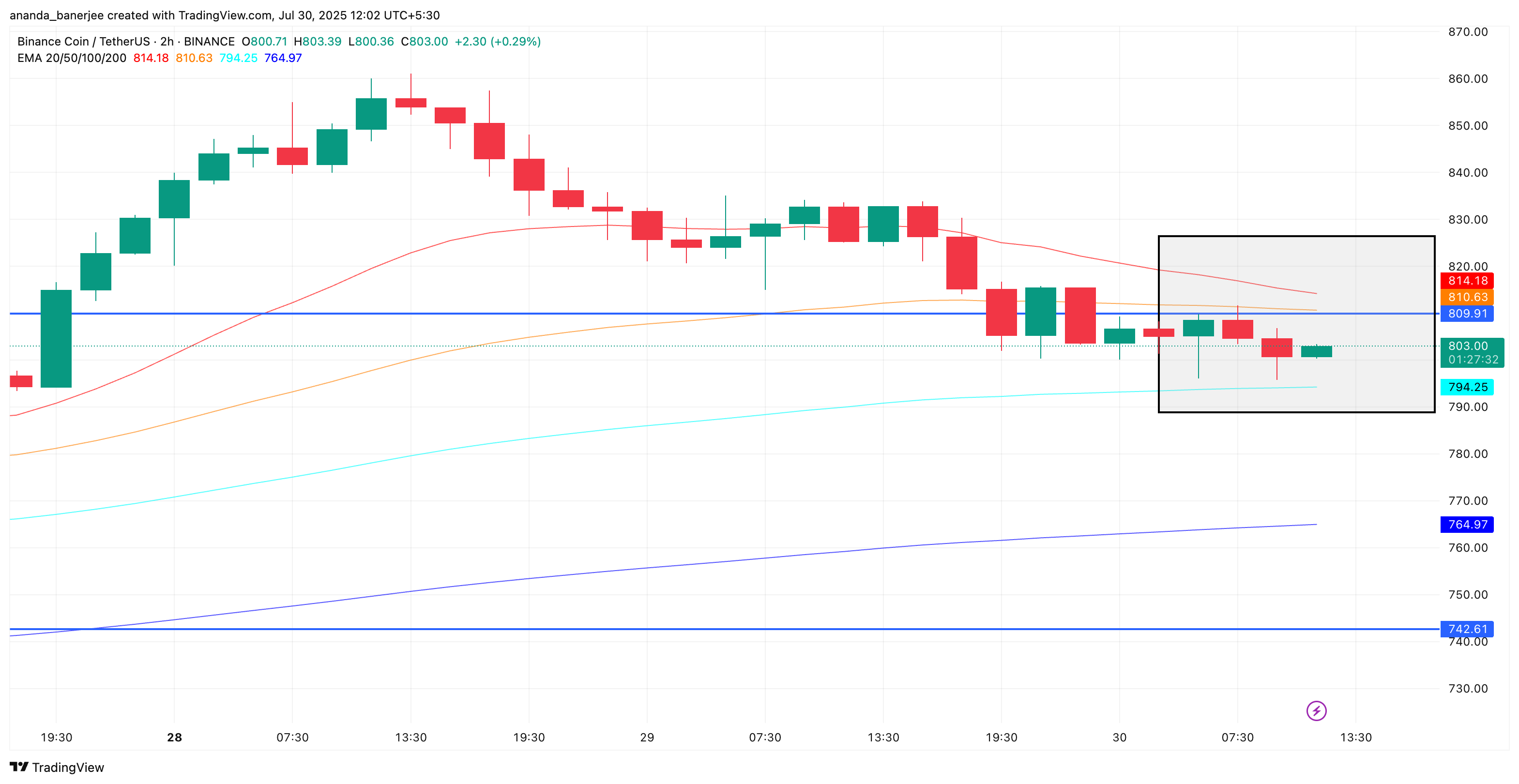 BNB:s explosiva uppgång till ett nytt rekord på 858 USD för några dagar sedan har snabbt avtagit. Nu ligger myntet runt 800 USD, en nedgång på nästan 7 % de senaste 24 timmarna. Den snabba vändningen får handlare att undra om ett nytt rekord är nära, eller om säljare redan stramar åt sitt grepp.