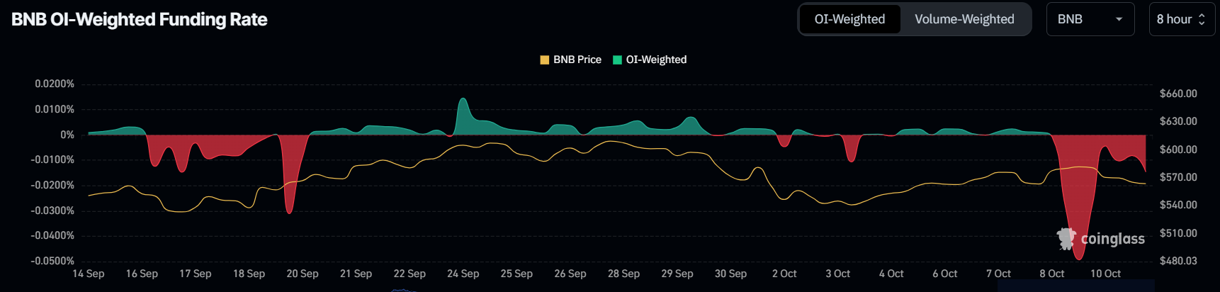 Marknadssentimentet kring BNB är fortfarande mycket baisseartat, vilket framgår av finansieringsräntan. Den negativa räntan visar att handlare i allt högre grad placerar korta kontrakt och satsar på ett prisfall. Denna trend återspeglar en marknadsmiljö där handlare förväntar sig att värdet på BNB kommer att sjunka inom en snar framtid.