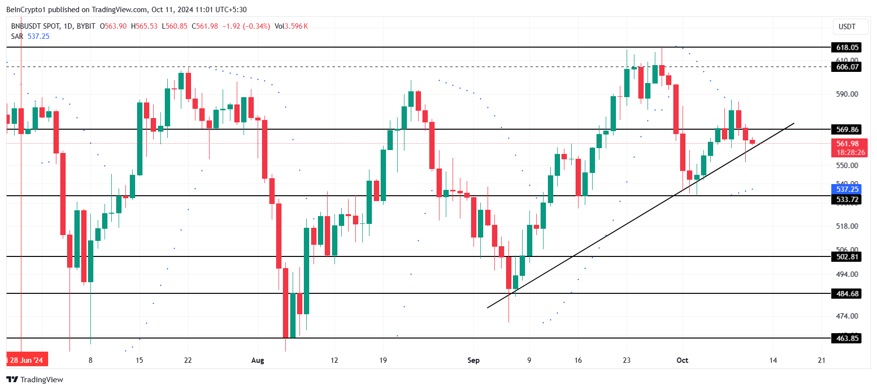 Trots det baisseartade marknadssentimentet har BNB varit i en uppåtgående trend sedan början av september. Även om det misslyckades med att bryta motståndet vid 606 dollar förra månaden, har altcoinet fortsatt att testa sin uppåtgående trendlinje som stöd. För närvarande håller BNB återigen denna stödnivå och visar motståndskraft mot en bredare svaghet på marknaden.