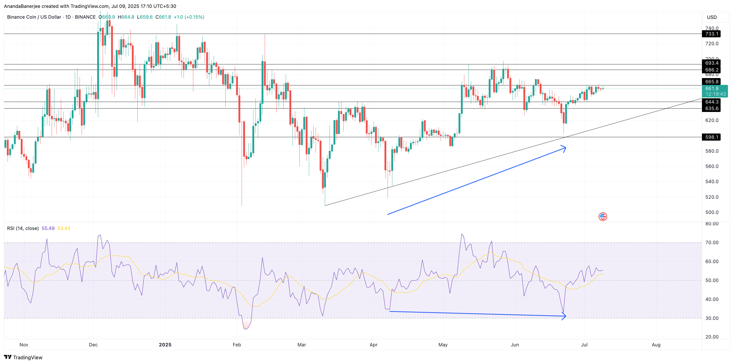 Detta mönster signalerar vanligtvis ett kommande utbrott, men det är bara giltigt om strukturen håller. Hittills handlas BNB nära 661 USD, precis under det omedelbara men starka motståndsnivån på 665 USD. Om BNB-priset lyckas bryta denna nivå, skulle det också innebära ett mönsterutbrott.