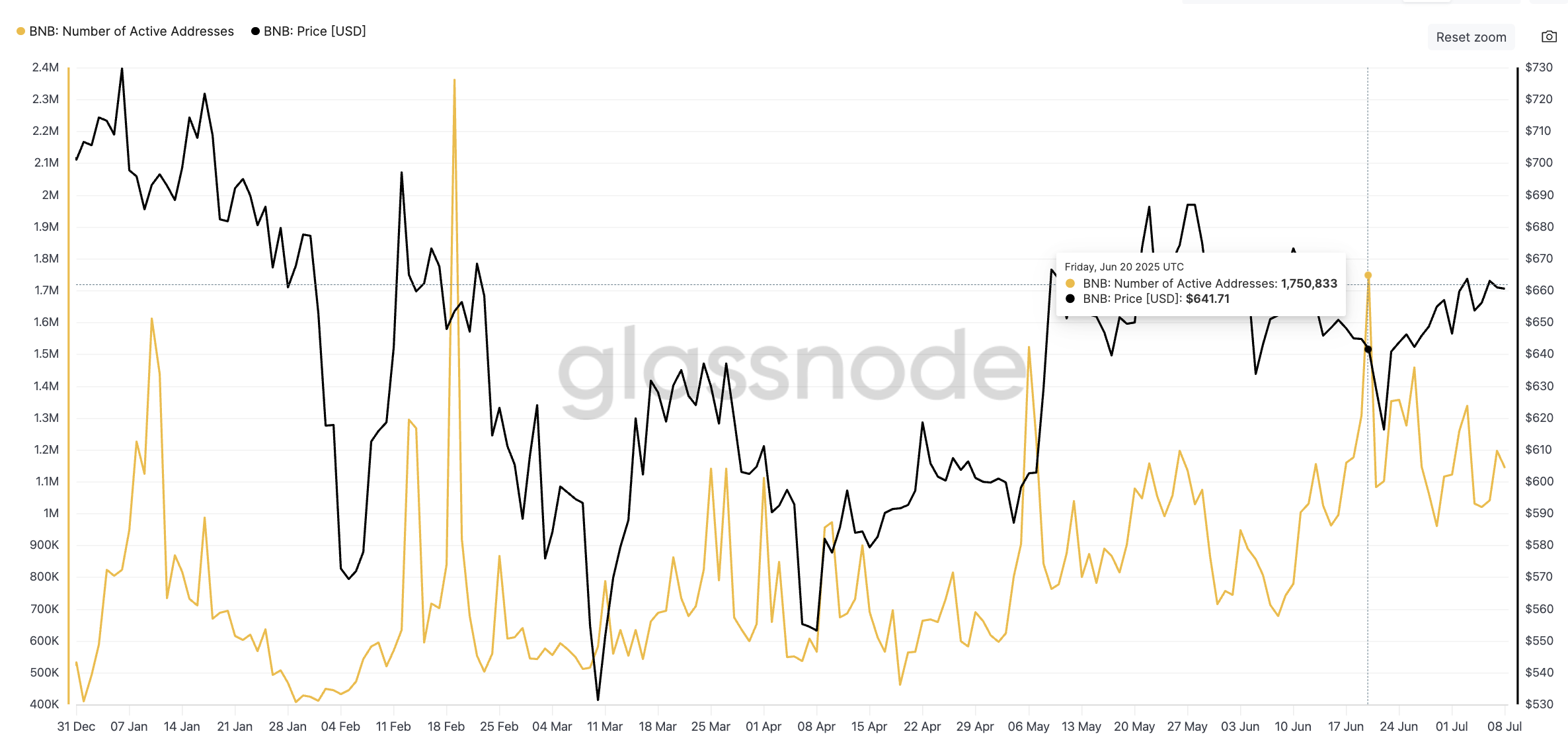 BNB:s antal aktiva adresser har ökat stadigt sedan början av maj. Efter att ha sjunkit under större delen av mars och april började deltagandet återhämta sig, med en betydande högre topp den 20 juni, nådde över 1,75 miljoner dagliga adresser.