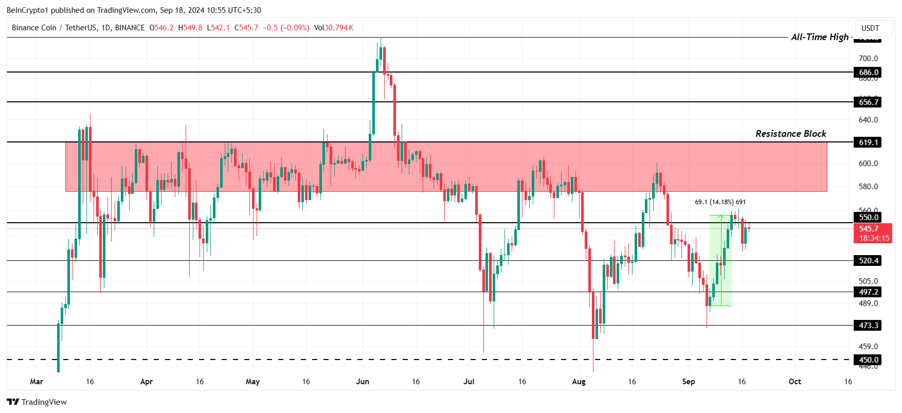 BNB:s pris har misslyckats flera gånger med att omvandla motståndszonen mellan 575 USD och 619 USD till stöd.