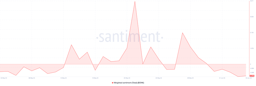 Trots uppgången har viss bearish aktivitet dröjt sig kvar på BONK-marknaden. Det negativa viktade sentimentet som BONK har registrerat sedan den 30 maj belyser den baisseartade bias mot altcoin. Vid pressläggning var BONK:s viktade sentiment -0,79.