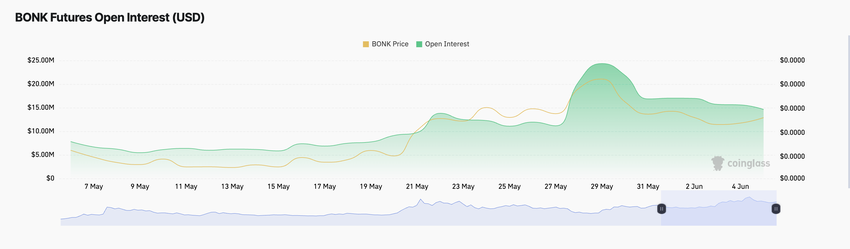 BONKs öppna intresse för terminer spårar det totala antalet utestående terminskontrakt eller positioner som inte har stängts eller avvecklats. När det minskar signalerar det en nedgång i marknadsaktiviteten när handlare lämnar sina handelspositioner utan att öppna nya.