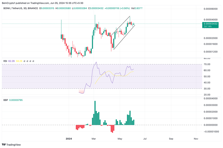 Avläsningar från dess Relative Strength Index (RSI) visade att köpmomentum uppväger säljtryck. I skrivande stund var BONKs RSI 62,25.