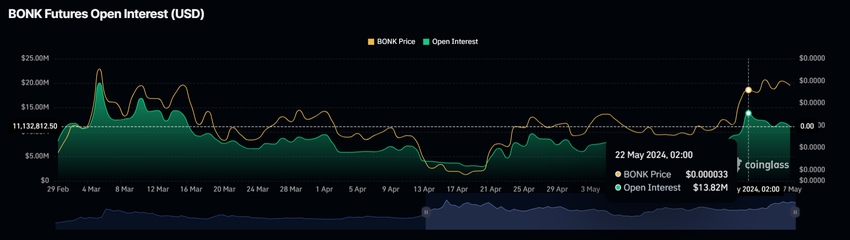 Öppet intresse avser det totala antalet utestående derivatkontrakt, såsom optioner eller terminer, som inte har avvecklats. BONK:s öppna intresse sjönk med 20% på fem dagar från 13,8 miljoner USD till 11,1 miljoner USD.