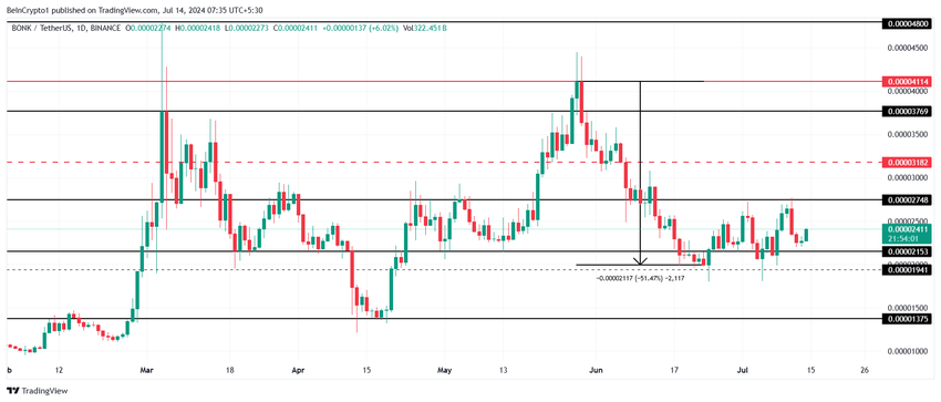 BONK, som liggerpå 0,00002411 dollar, lyckas för närvarande inte bryta motståndet på 0,00002748 dollar. Tillsammans med de ovan nämnda faktorerna tyder detta misslyckande på att ett utbrott till $0,00003000 är osannolikt för tillfället. Således kan meme-myntet komma att konsolideras till $0,00002748 och $0,00002153.