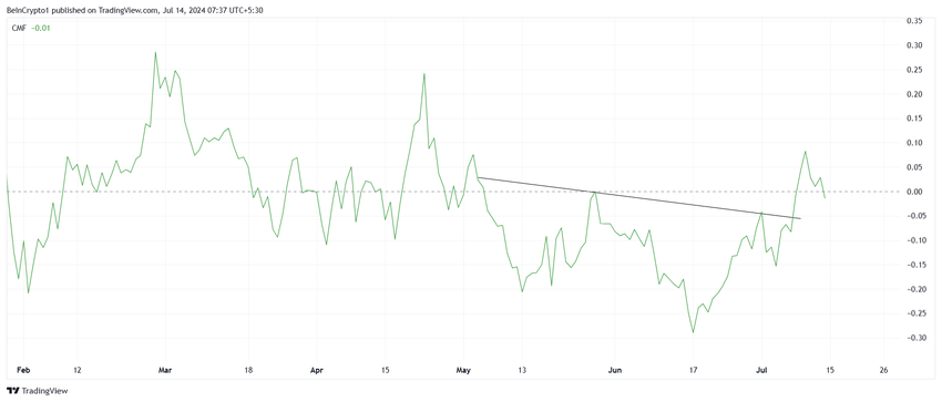 BINK-priset noterar effekten av den stigande baisseartade inställningen till altcoin. BONK:s Chaikin Money Flow (CMF)-indikator bröt nyligen igenom sin nedåtgående trend, vilket signalerar ett potentiellt skifte i marknadssentimentet. Denna uppåtgående trend verkar dock vara på väg att avta, vilket ger upphov till farhågor om hållbarheten i denna trend.