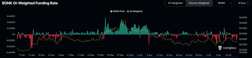 Utöver dessa farhågor har BONK:s finansieringsränta blivit negativ igen bara några dagar efter att kortvarigt ha varit positiv. En negativ finansieringsränta indikerar vanligtvis att korta positioner betalar långa positioner. Detta tyder på en dominans av korta kontrakt, vilket återspeglar ett baisseartat sentiment bland investerare.