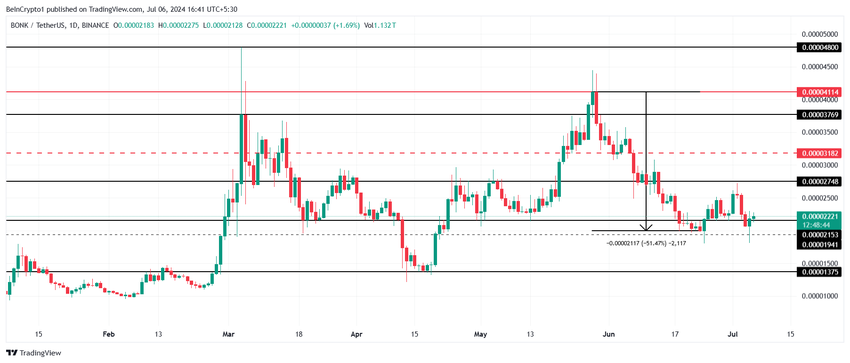 BONK:s pris på $0,00002221 lyckas på något sätt hålla sig över det kritiska stödet vid $0,00002153. Efter att ha försökt falla under det två gånger nu ser meme-myntet ut att återhämta sig, men investerarna stöder inte detta.
