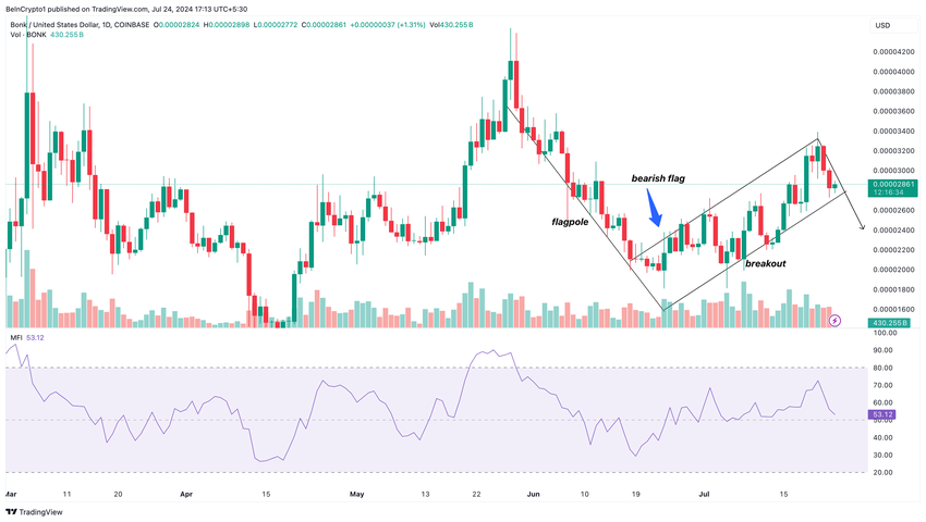 På det dagliga diagrammet observerar BeInCrypto att BONK har bildat en baisseartad flagga. Detta tekniska mönster uppstår när priset på kryptovaluta sjunker under en period. Men däremellan finns det en kort konsolideringsperiod som så småningom hjälper till att bilda en lutande vertikal flaggstång.