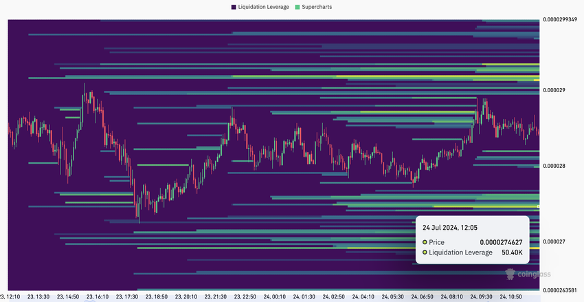 För BONK:s pris visar värmekartan ovan att likvidationsnivåerna har ändrats från lila till gult runt $0,000027. En annan är runt $0,000026, vilket innebär att dessa punkter är områden med hög likviditet och att priset kan konvergera mot regionerna.