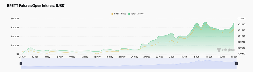 Uppgången i BRETT:s pris under den senaste månaden har lett till en ökning av aktiviteten på terminsmarknaden. Detta kan utläsas av dess stigande öppna intresse för terminer.