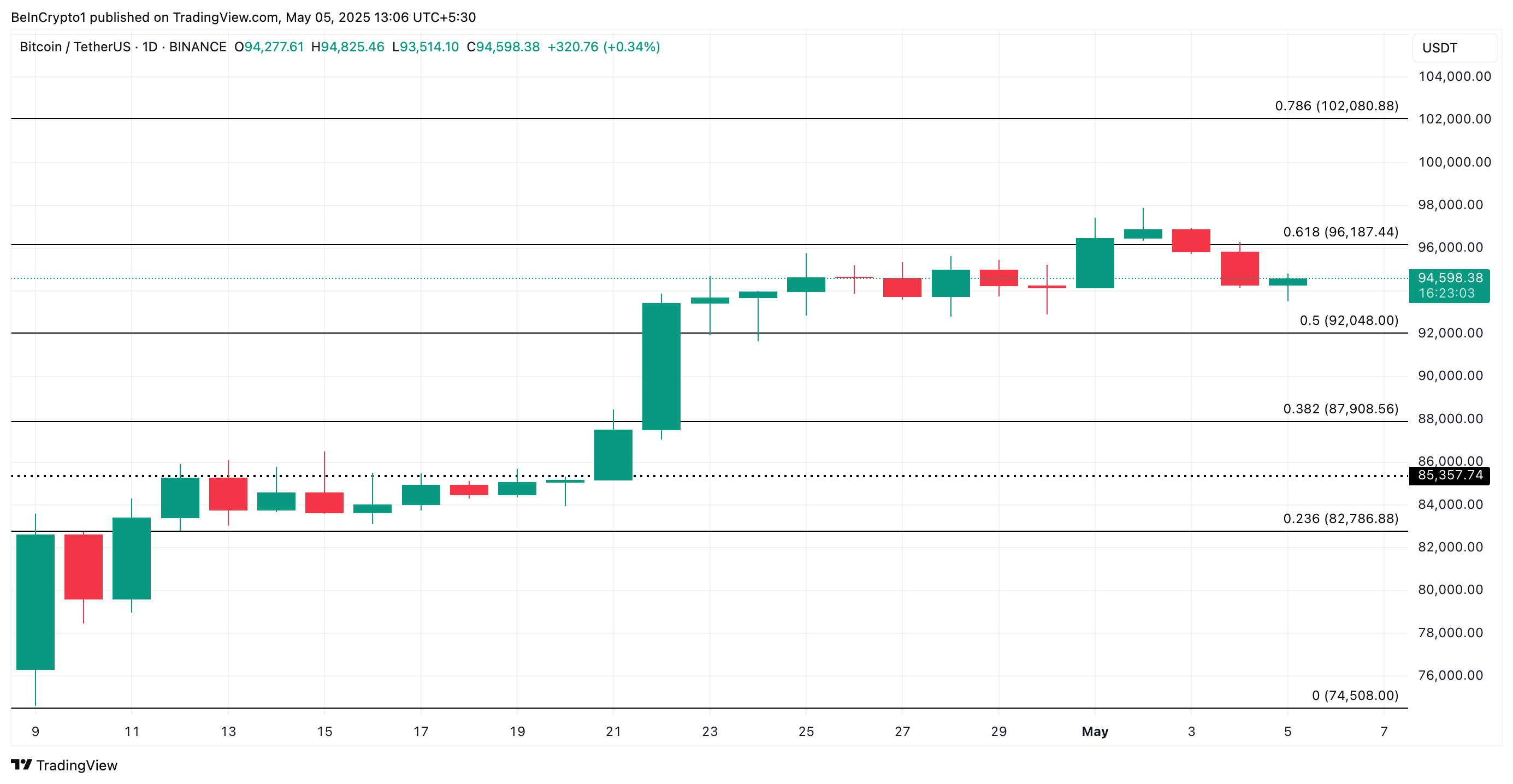 Men denna negativa utsikt kan ogiltigförklaras om köparna återtar marknadskontrollen. I så fall kan BTC återhämta sig, stiga över 95 000 USD och rally mot 96 187 USD.