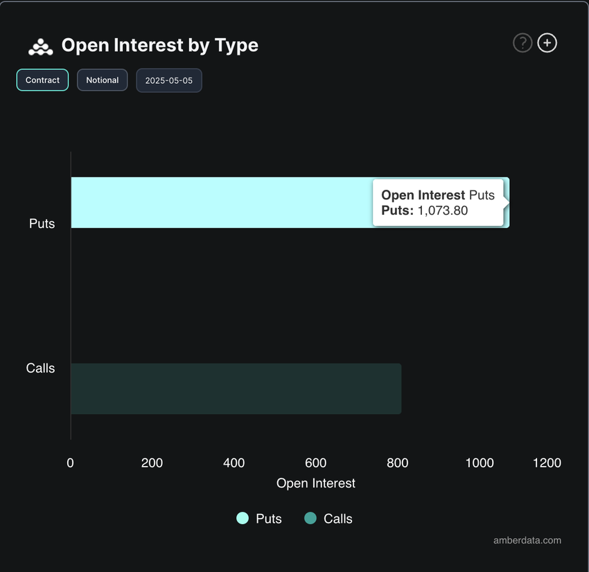 Detta betyder att det finns betydligt fler öppna put-kontrakt—satsningar på att BTC:s pris kommer att falla—än call-kontrakt, som vanligtvis är optimistiska. Ett förhållande över ett indikerar att BTC-skeptiker skyddar sig mot ytterligare nedgång eller aktivt positionerar sig för en prisnedgång på kort sikt.
