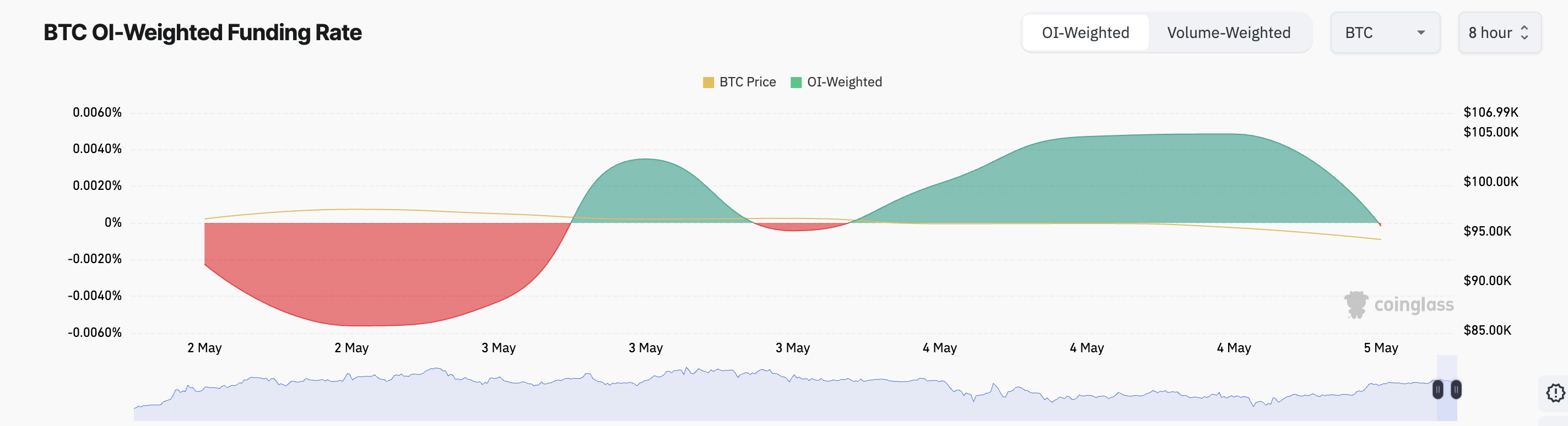 Dessutom förstärker BTC:s ständigt negativa finansieringsränta denna negativa utsikt. Data från Coinglass visar att sedan 1 maj har myntets finansieringsränta haft fler dagar i rött än i grönt, vilket återspeglar en växande preferens för korta positioner bland terminsinvesterare.