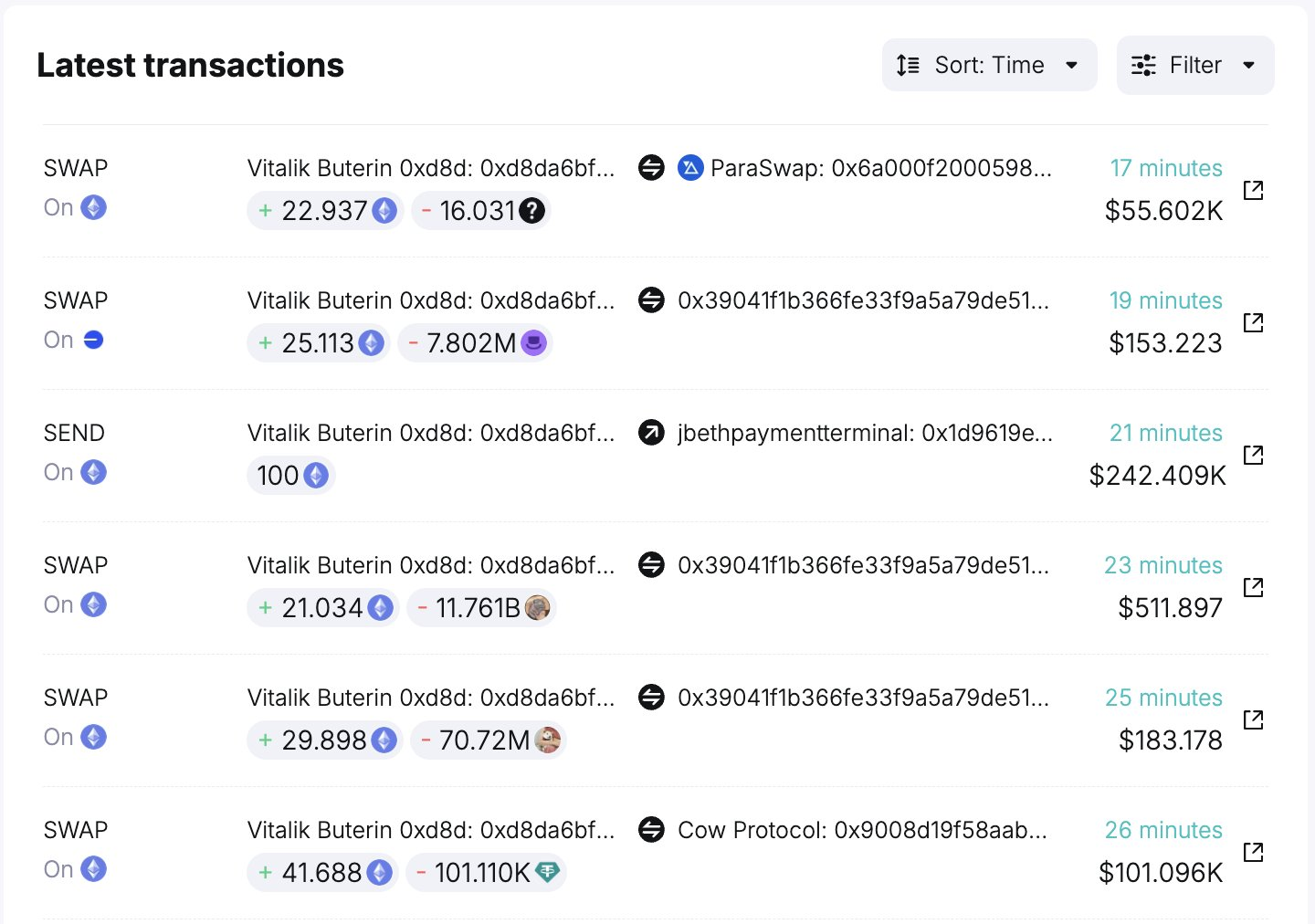 De andra tillgångarna han sålde inkluderade 7,8 miljoner Degen för 25 ETH (cirka 61 000 USD) och 16 miljarder Kabosu-tokens för 22,94 ETH (ungefär 56 000 USD). Dessutom konverterade Buterin hela sitt saldo av USDT, 101 000 USDT, till 41,69 ETH.