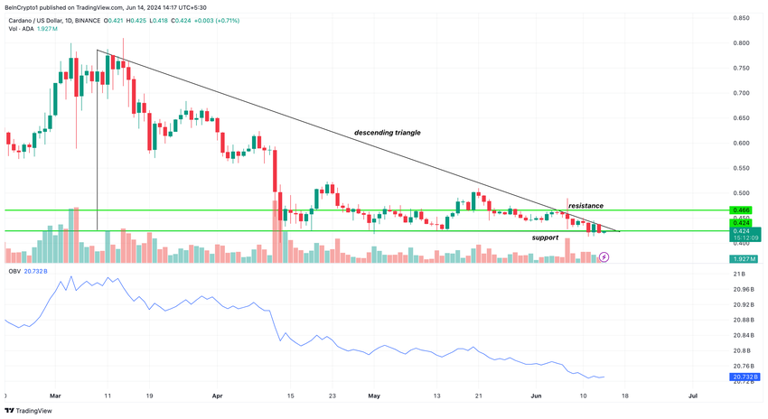 Samtidigt analyserade BeInCrypto kryptovalutans potential på det dagliga diagrammet. Enligt vår analys har ADA bildat en fallande triangel.