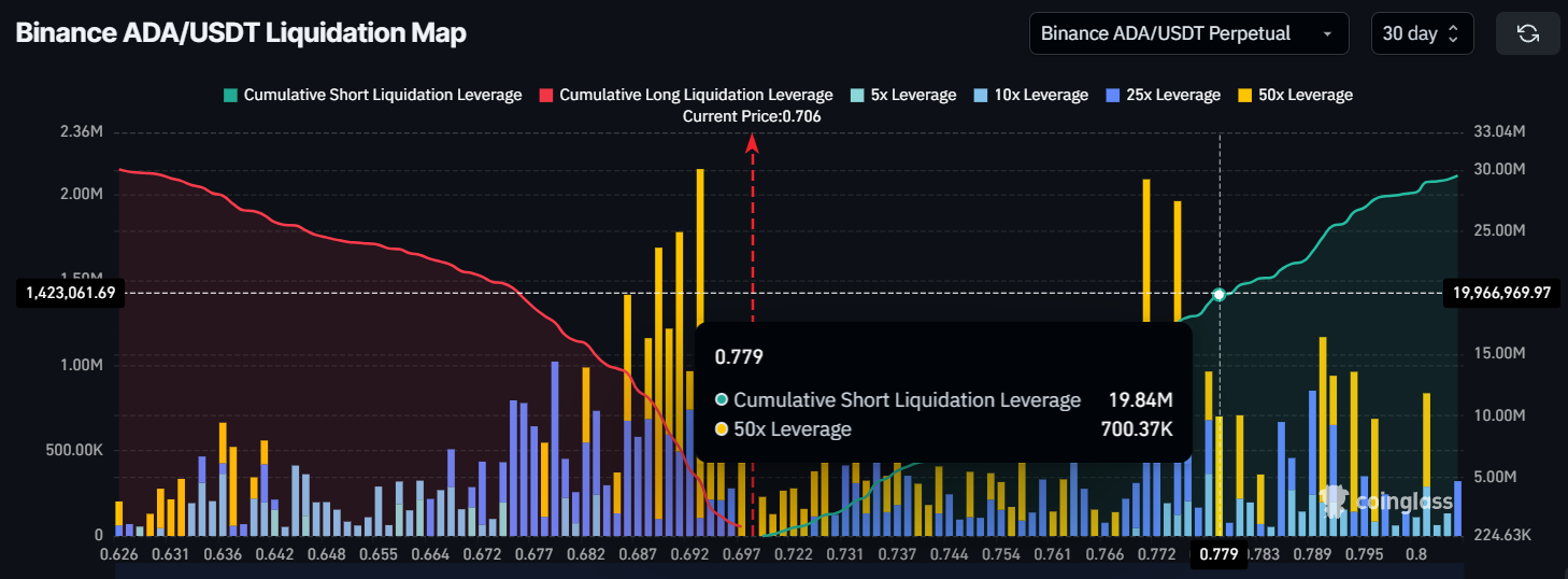 Stämningen kring Cardano (ADA) är blandad. Enligt Liquidation Map är korta handlare i underläge om ADA fortsätter sin uppåtgående trend. Ett genombrott av 0,77 USD skulle leda till likvidation av cirka 20 miljoner USD i korta kontrakt.