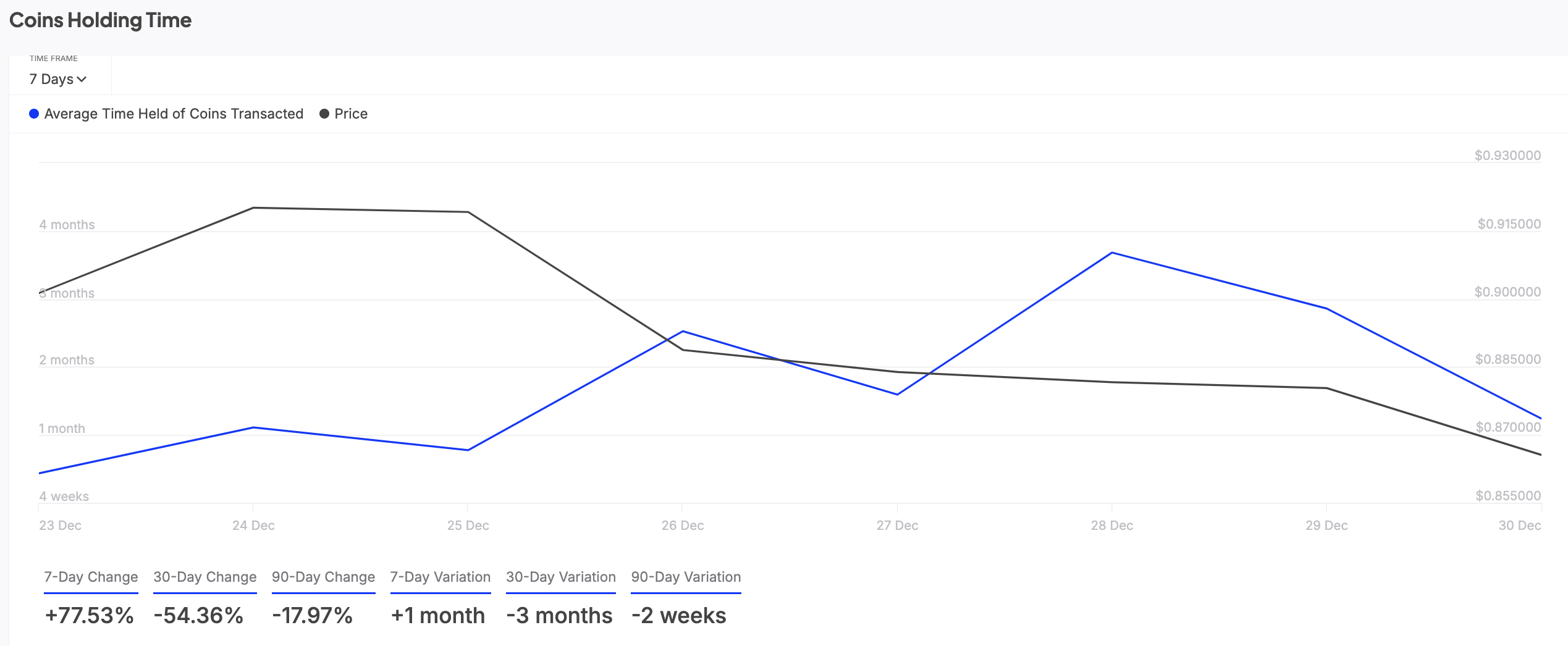 Innehavstiden för ett tillgångs transakterade mynt representerar den genomsnittliga tiden tokens hålls i plånböcker innan de säljs eller överförs.
