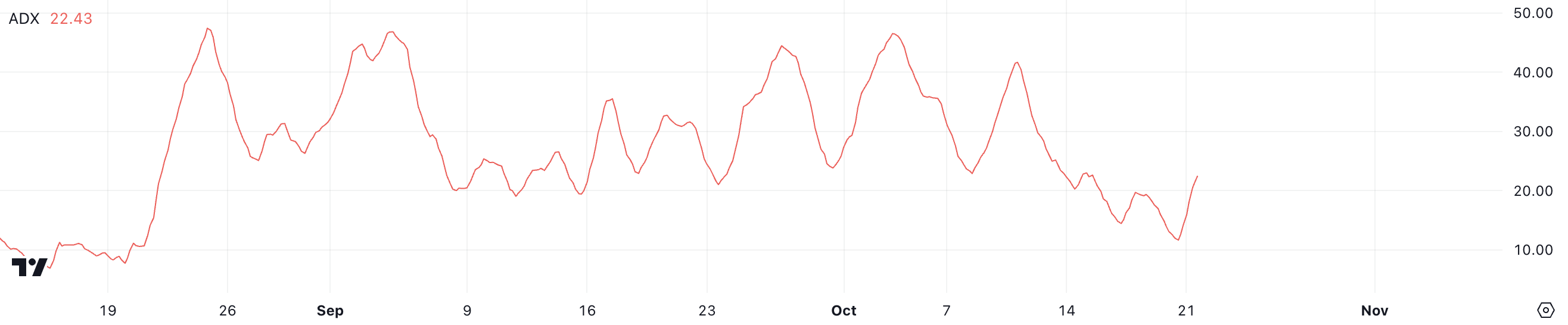Average Directional Index (ADX) är en teknisk indikator som mäter trendens styrka. Den varierar från 0 till 100, där värden under 20 tyder på en svag eller obefintlig trend, medan värden över 25 indikerar en stark trend. ADAs ADX är för närvarande 22,43, upp markant från 11 bara en dag tidigare.