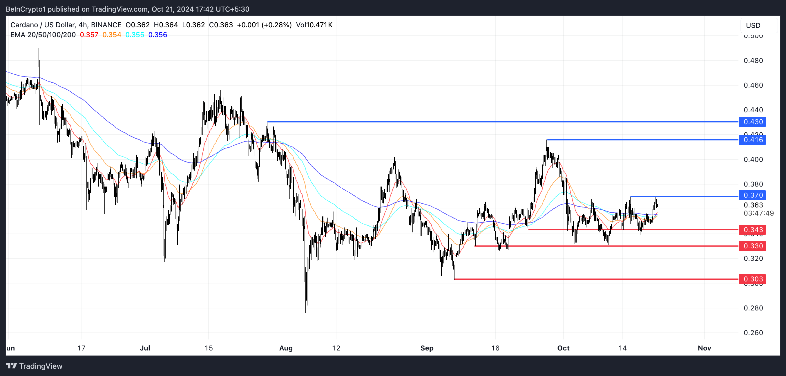 Cardano (ADA) står inför tydliga motståndsnivåer vid 0,37 USD och 0,416 USD. Ett genombrott över dessa nivåer kan öppna dörren för ytterligare uppsida, med ett potentiellt mål på 0,43 USD.