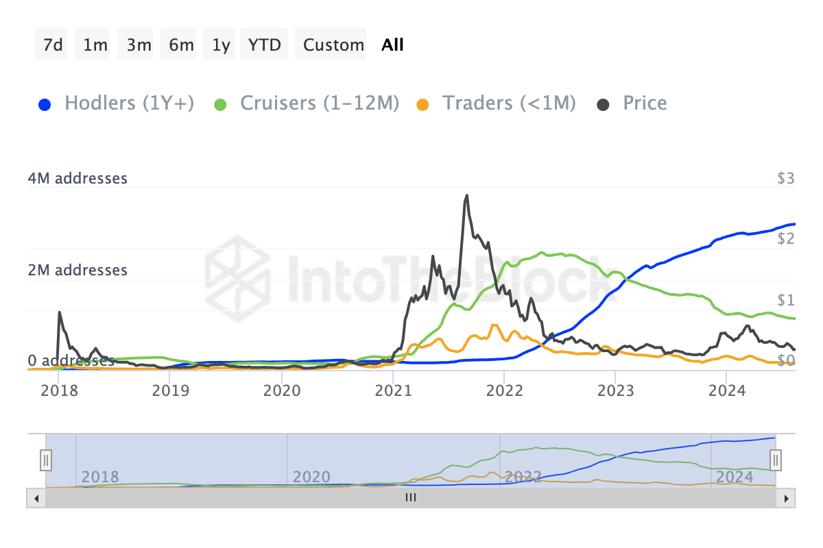 Data från metriken “Balance by Time Held” visar att antalet långsiktiga Cardano (ADA) innehavare har nått en rekordhög nivå på 3,2 miljoner. Dessa långsiktiga innehavare är vanligtvis de som har haft ADA i minst ett år.