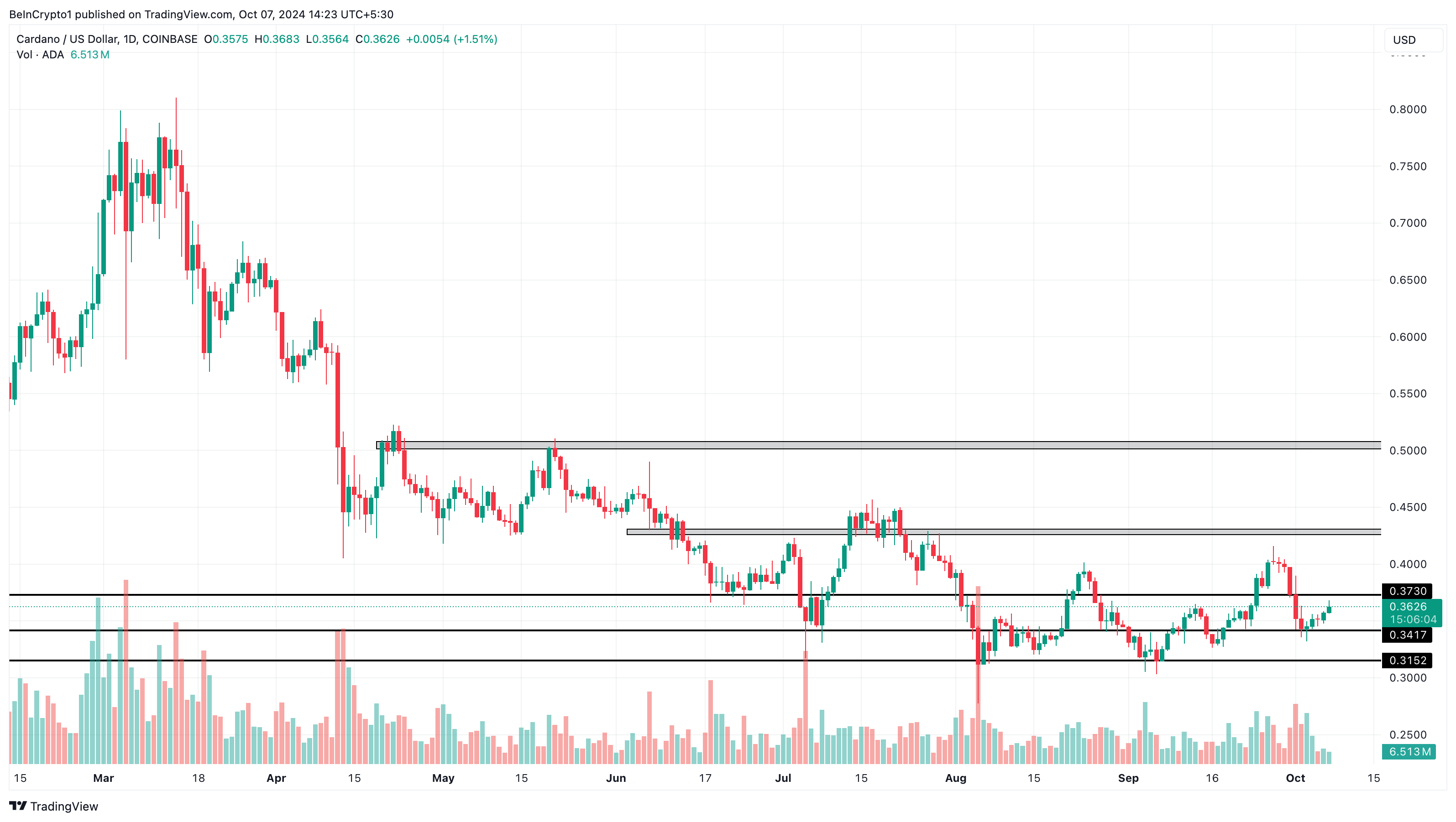 Efter sin senaste hopp närmar sig ADA två stora tillgångszoner: en vid 0,42 USD och den andra runt 0,50 USD. En analys av det dagliga diagrammet visar att Cardano kan möta motstånd runt 0,37 USD.