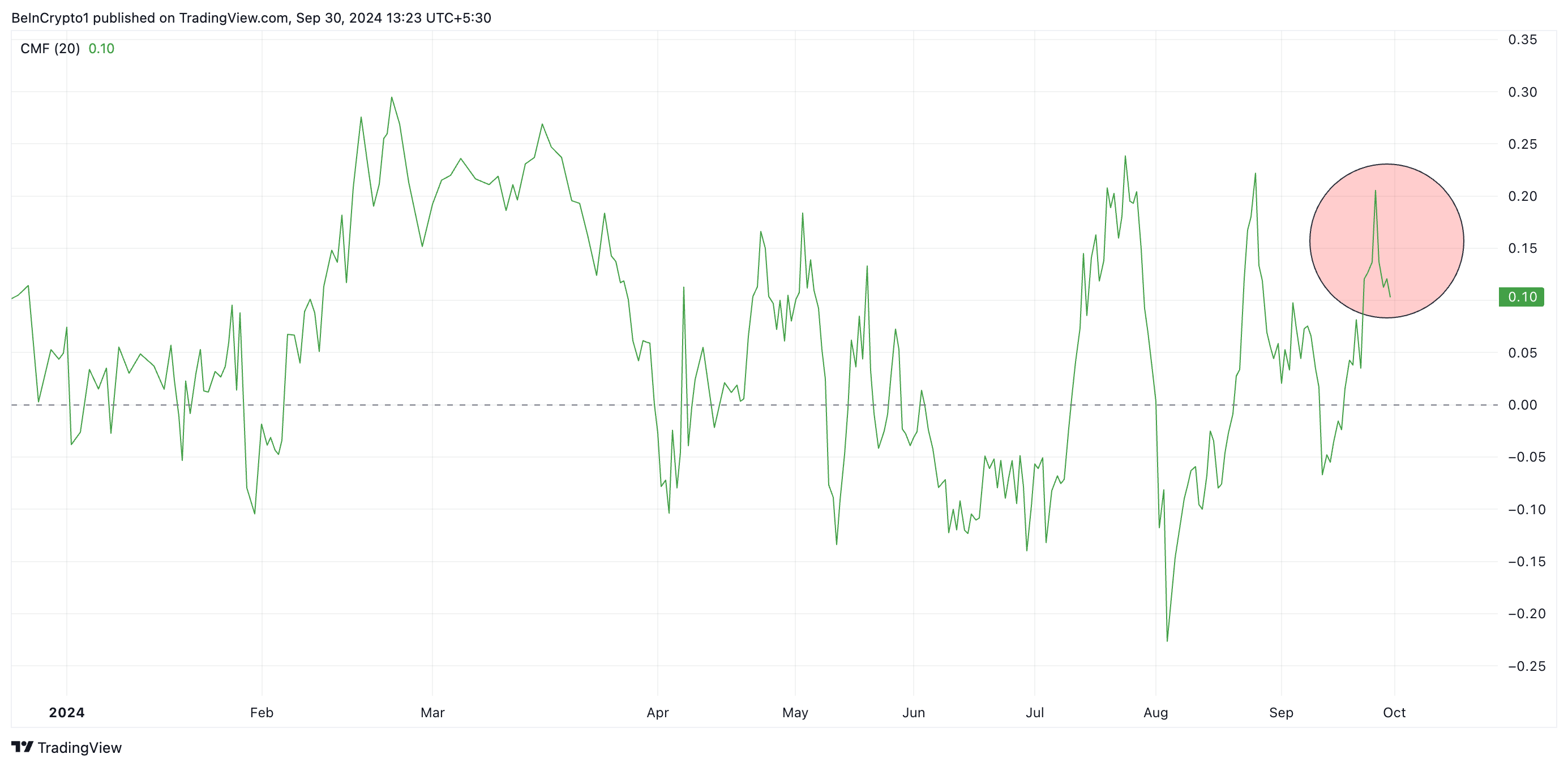 Cardanos Chaikin Money Flow (CMF) har sjunkit de senaste dagarna. CMF spårar kapitalflödet in och ut ur marknaden, och även om det fortfarande är positivt, kan dess gradvisa minskning tjäna som en varningssignal.