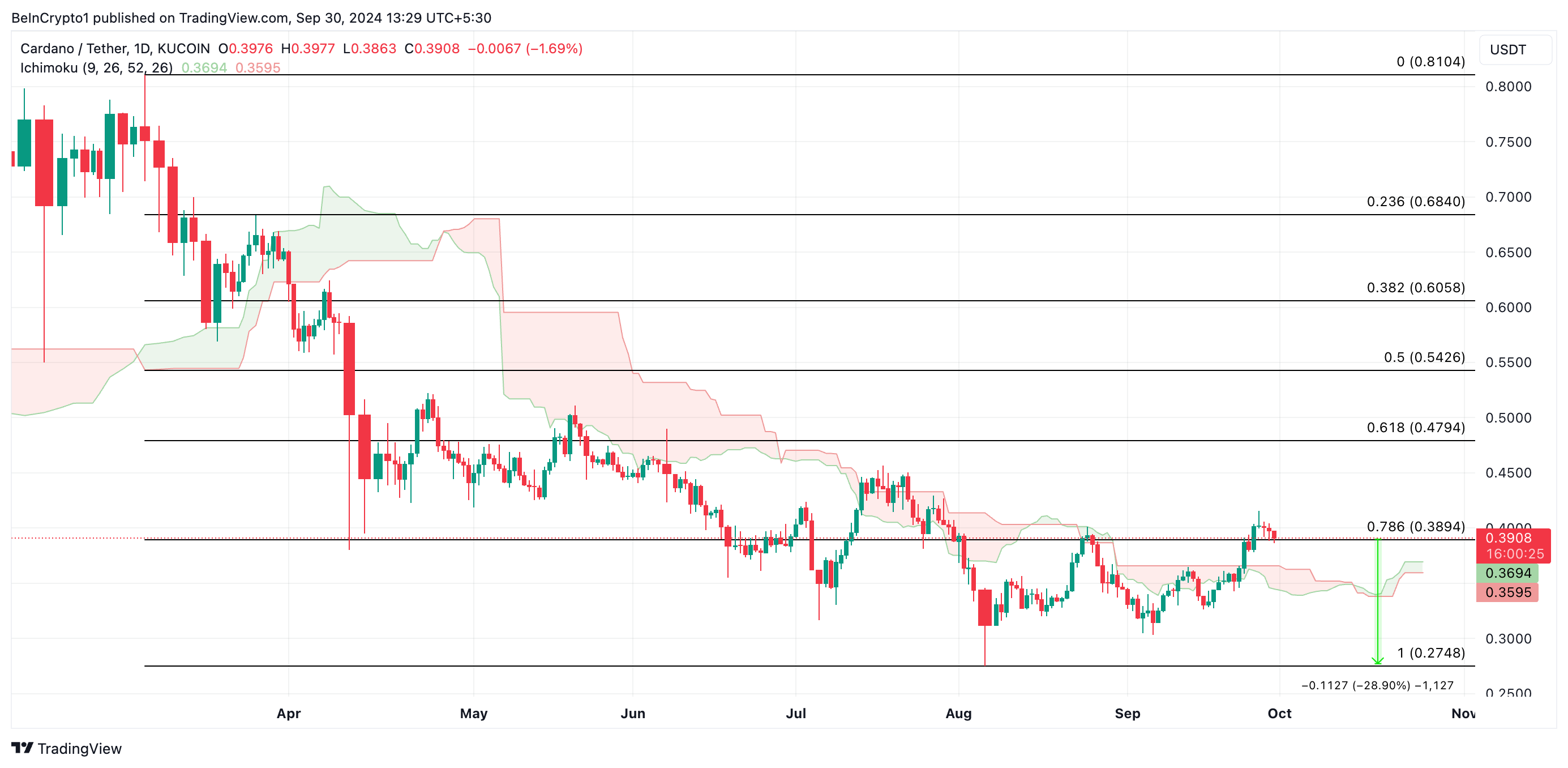 Cardano är för närvarande prissatt till 0,39 USD och ser ut att falla under sitt Ichimoku-moln, som nyligen blev en stödnivå.