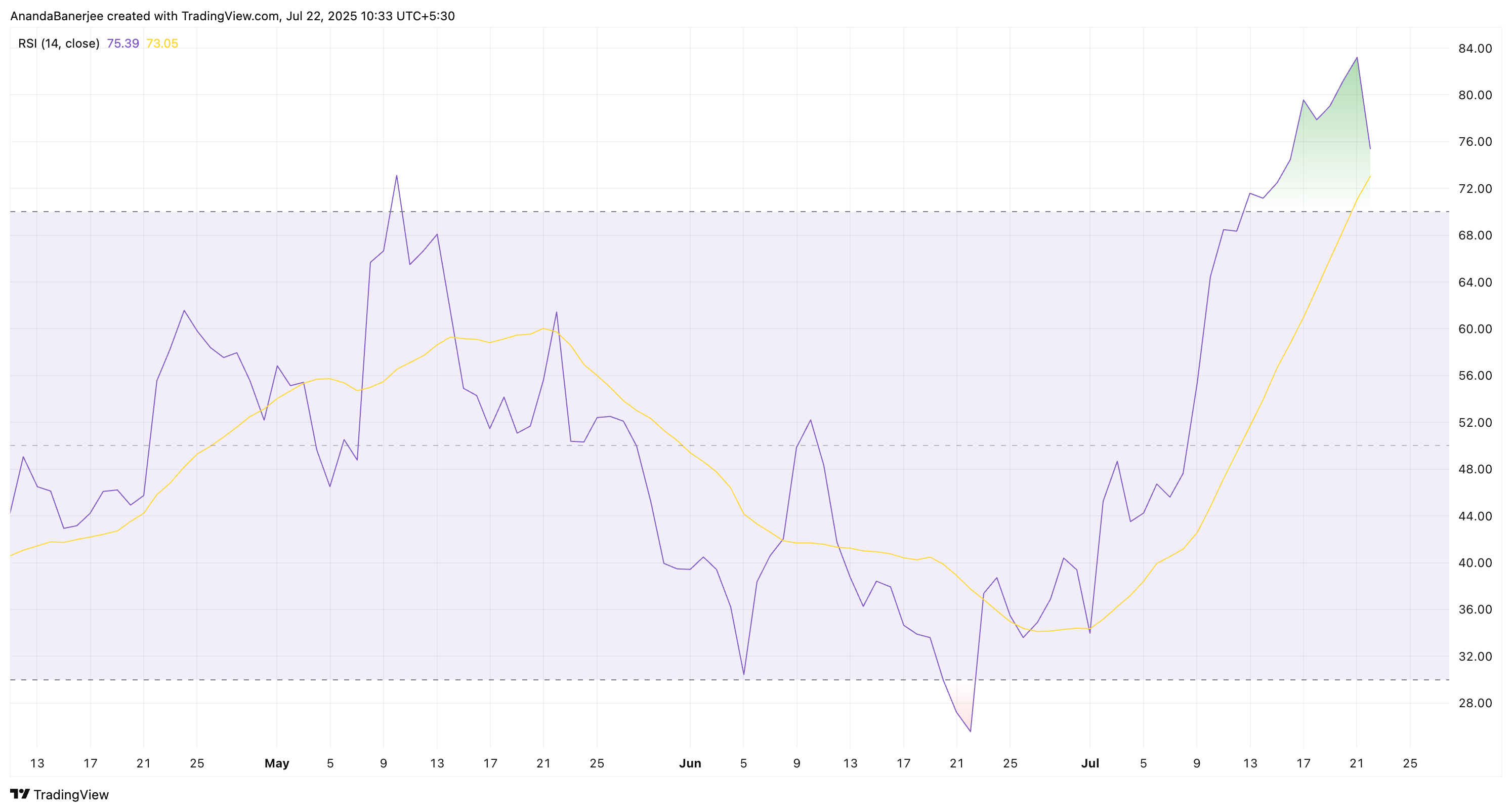 Momentumindikatorer förstärker också den negativa inställningen. Cardanos 14-dagars RSI nådde nyligen 82,6, djupt in i överköpt territorium, innan den vände nedåt. Relative Strength Index (RSI) spårar hur snabbt och starkt priset har rört sig i de senaste sessionerna. Avläsningar över 70 antyder överdriven optimism, vilket ofta föregår vändningar.