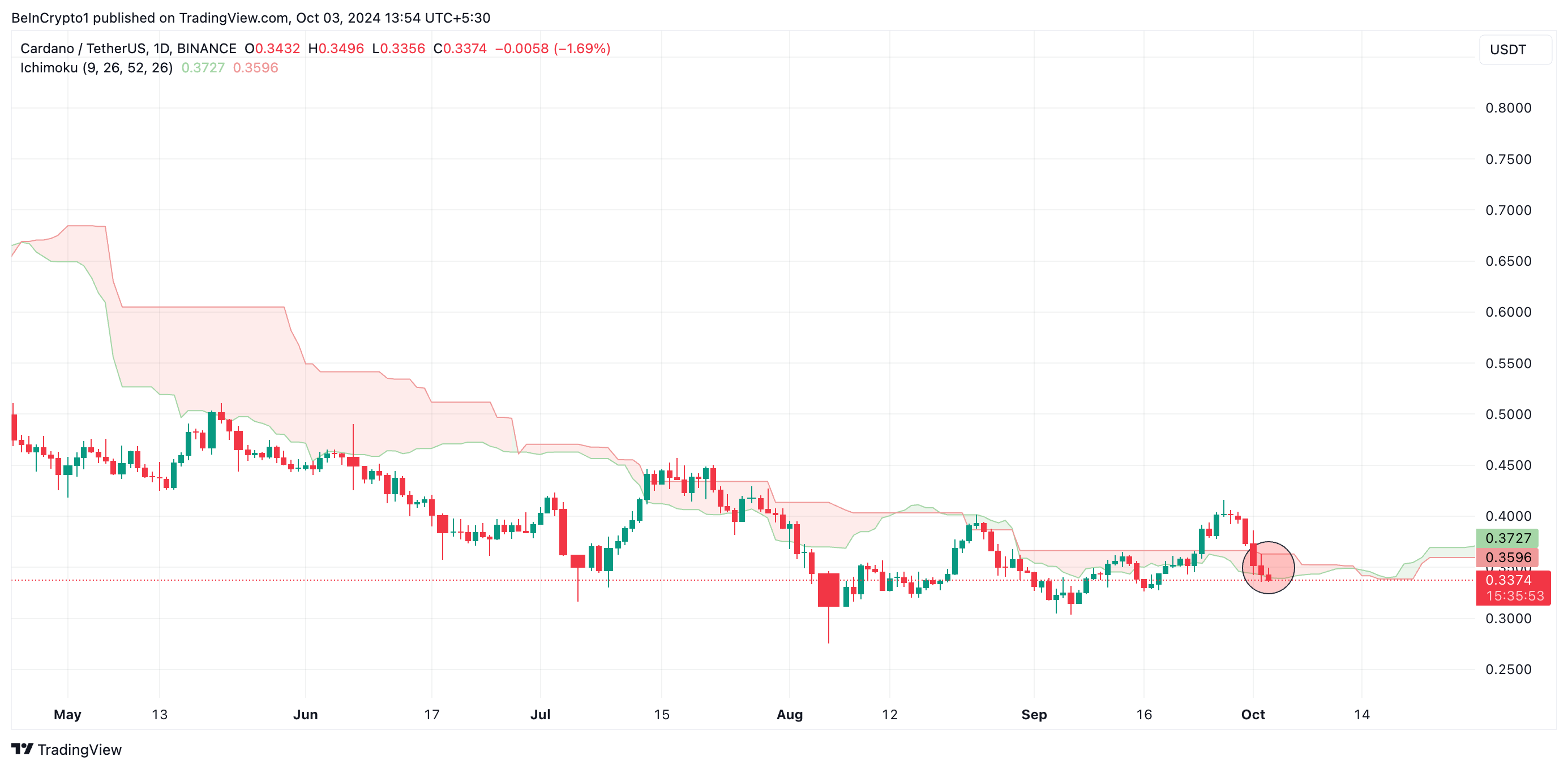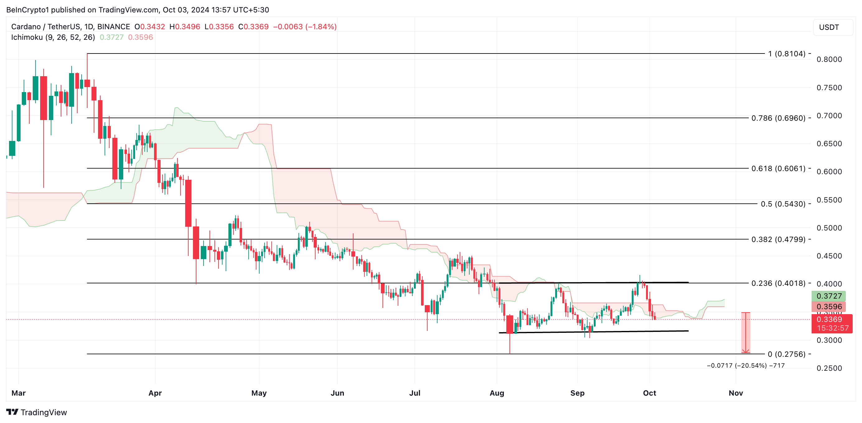 Trots detta framsteg har Cardanos pris inte speglat utvecklingen. Altcoinen handlas till 0,34 USD, vilket är en nedgång med 11% sedan den 1 oktober. På sin endagsdiagram befinner sig Cardano i en horisontell kanal och möter upprepade gånger starkt säljtryck vid motståndsnivån på 0,40 USD trots försök att bryta igenom.