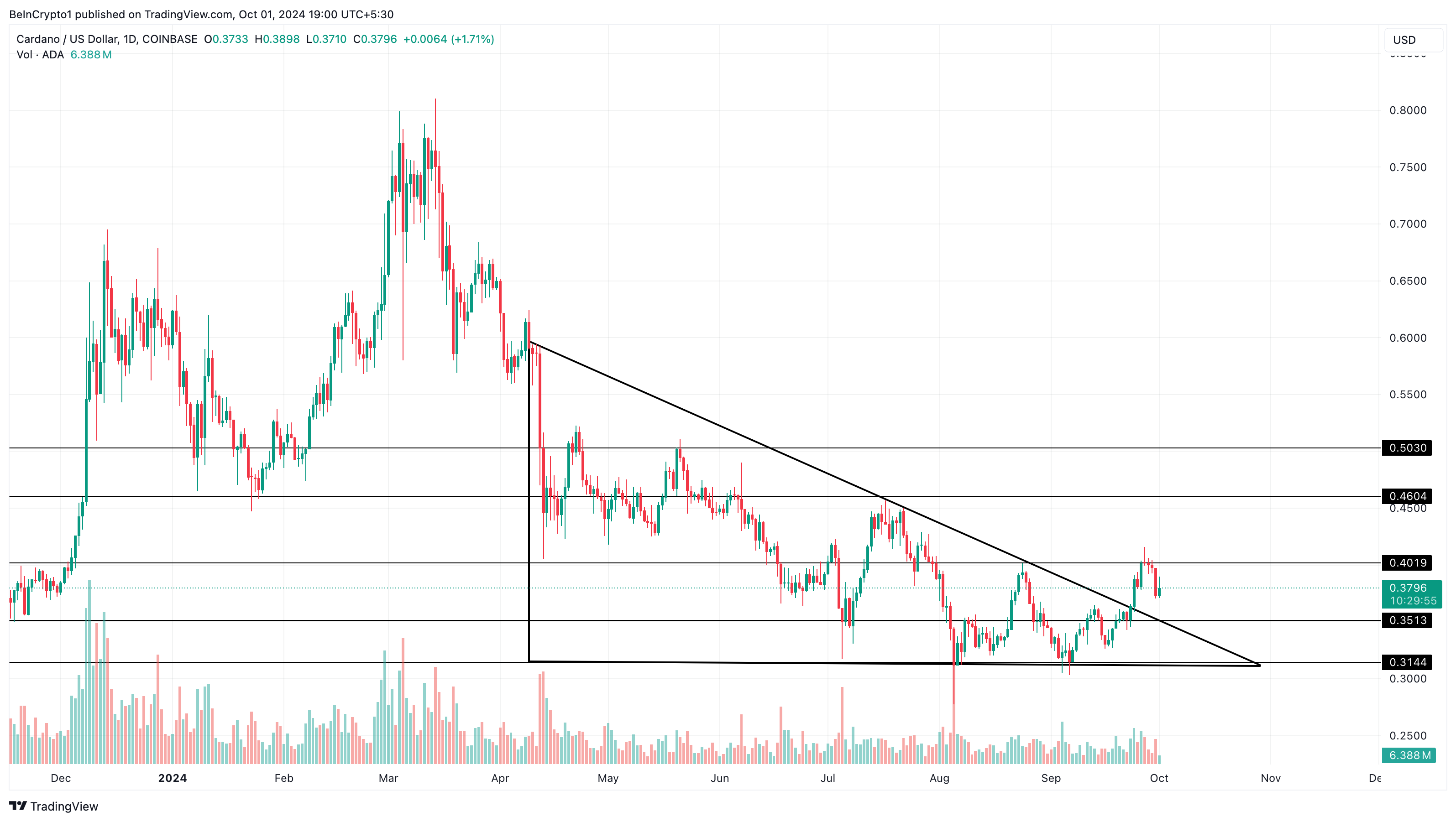 En utvärdering av det dagliga diagrammet visar att Cardanos pris bröt ut ur den nedåtgående triangeln den 22 september. På grund av detta steg ADA till 0,42 USD tidigare. Dock svänger token nu nedåt igen.