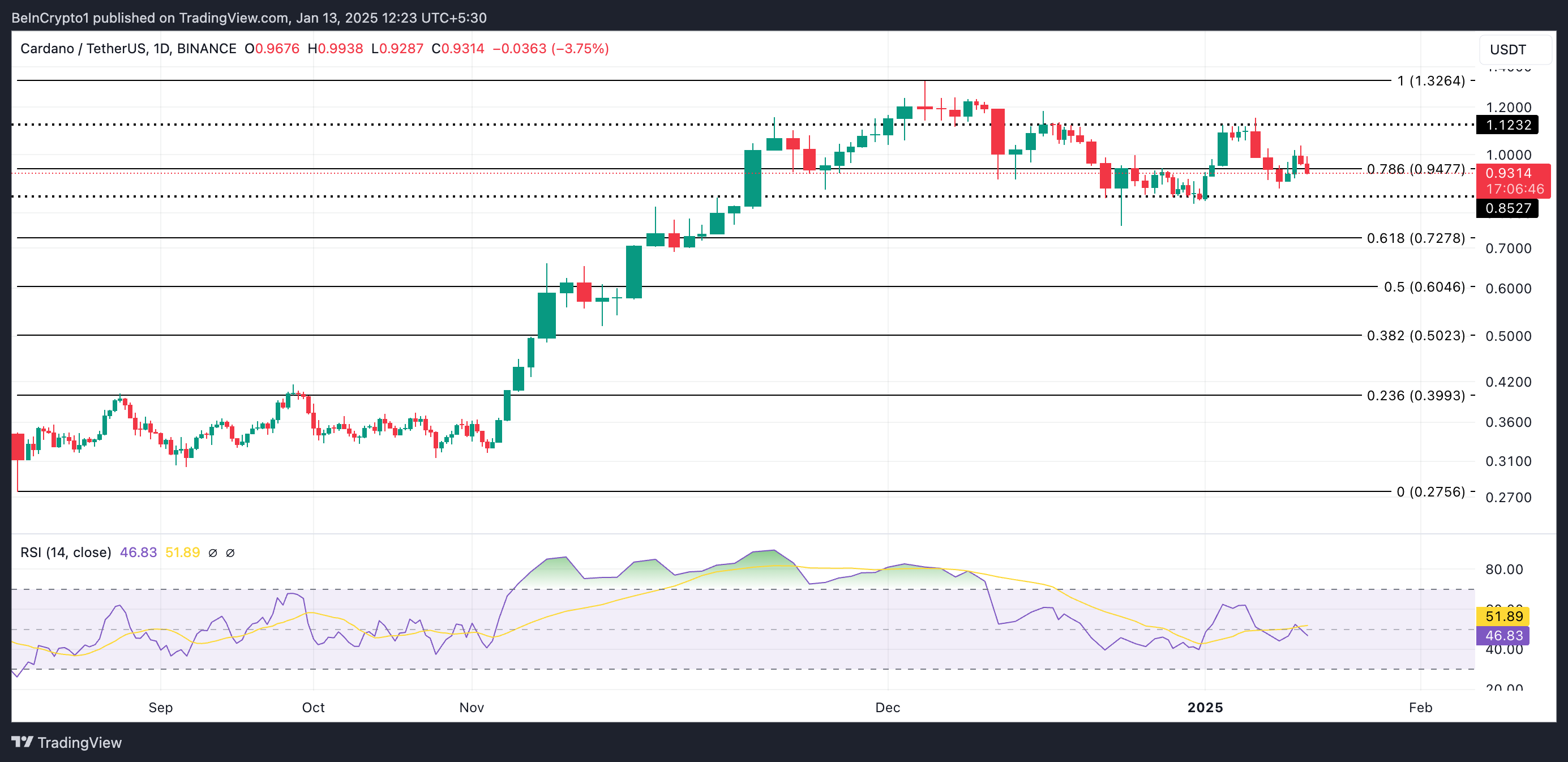 Vid 46,83 och i en nedåtgående trend, tyder ADAs RSI på att säljtrycket dominerar, vilket ökar sannolikheten för ytterligare prisnedgångar om inte köpaktionen ökar.