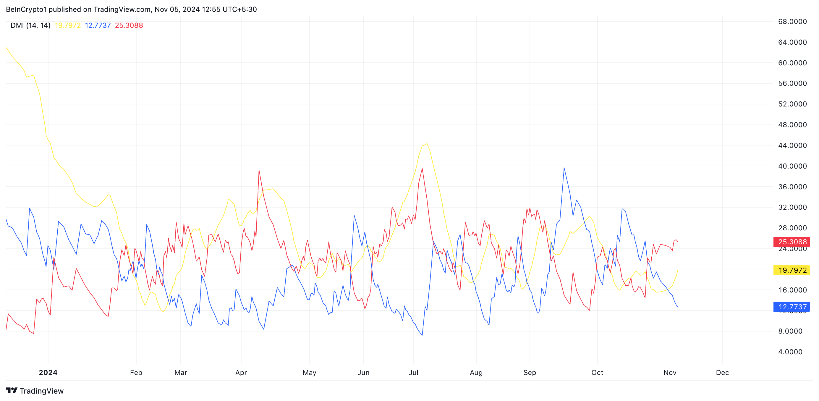 Avläsningar från TIAs riktningsrörelseindex (DMI) tyder på att sådant köptryck för närvarande saknas på myntets marknad, vilket förvärrar Celestias prisnedgång. För tillfället ligger altcoinens positiva riktningsindikator (+DI) (blå) under dess negativa riktningsindikator (-DI).