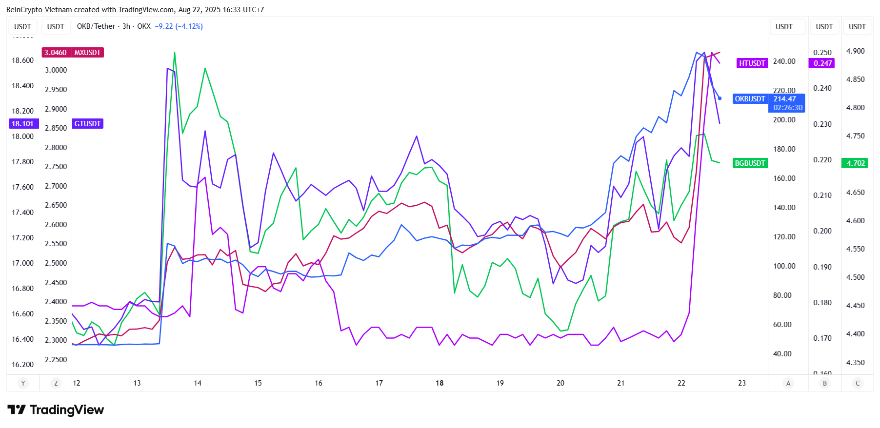 Ser man på prisutvecklingen för andra CEX-tokens, visade de en stark korrelation med OKB. De började alla sina uppgångar den 13 augusti, när OKB tillkännagav sin bränningsplan. De korrigerade senare och återhämtade sig den 22 augusti.