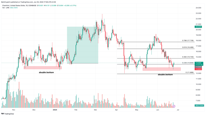 Det händer när priset når en stödnivå två gånger, vilket indikerar en paus i tillgångens nedåtgående trend. På det dagliga diagrammet bildade LINK ett liknande mönster mellan november 2023 och 10 januari i år.