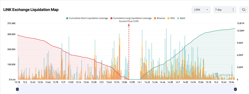 Enligt Coinglass, om Chainlinks pris når $15,62, är den kumulativa korta likvidationshävstången $12,56 miljoner. I icke-tekniska termer kommer handlare som har satsat på en LINK:s prissänkning med otillräcklig marginalbalans att förlora pengar om förutsägelsen skulle gå i lås.